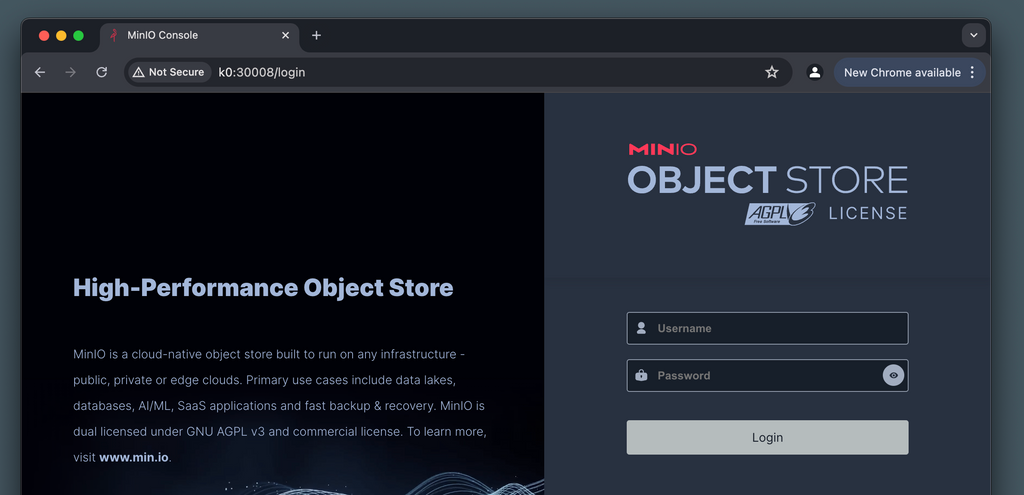 MinIO has two built-in services – the main storage service, as well as a console service, which we can use to create buckets, access keys, etc. We’ll expose the console service over a NodePort so we can use a web browser to set things up.