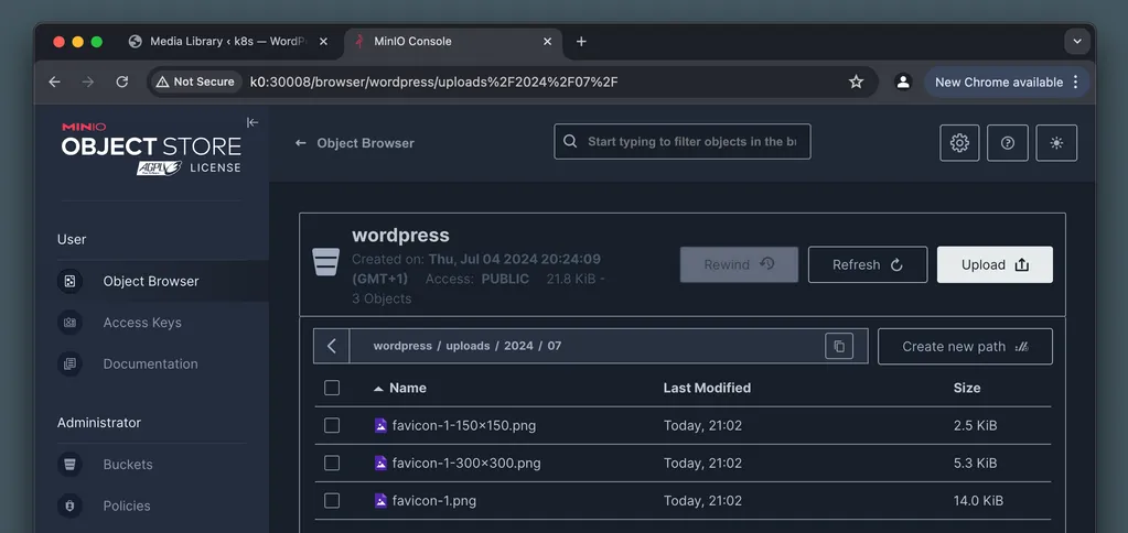 This alone however doesn’t tell us whether the image actually landed in our MinIO bucket, and not just being served from our WordPress pod.