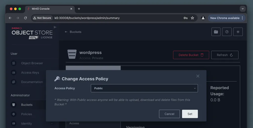 An access key created this way will have access to everything in this MinIO instance by default. If you’re planning to have more than one bucket, make sure you lock it down further using access policies.